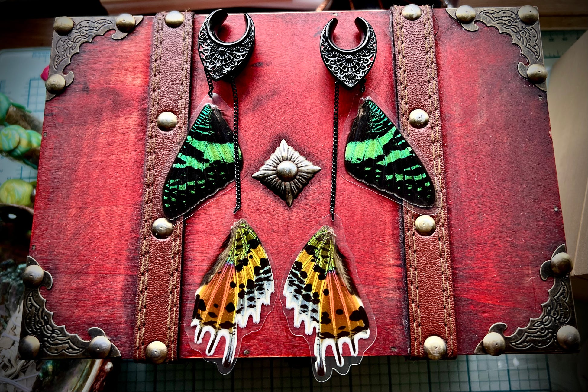 Custom 5/8th black cathedral plugs paired with holo graphic sunset moth forward and hind wings